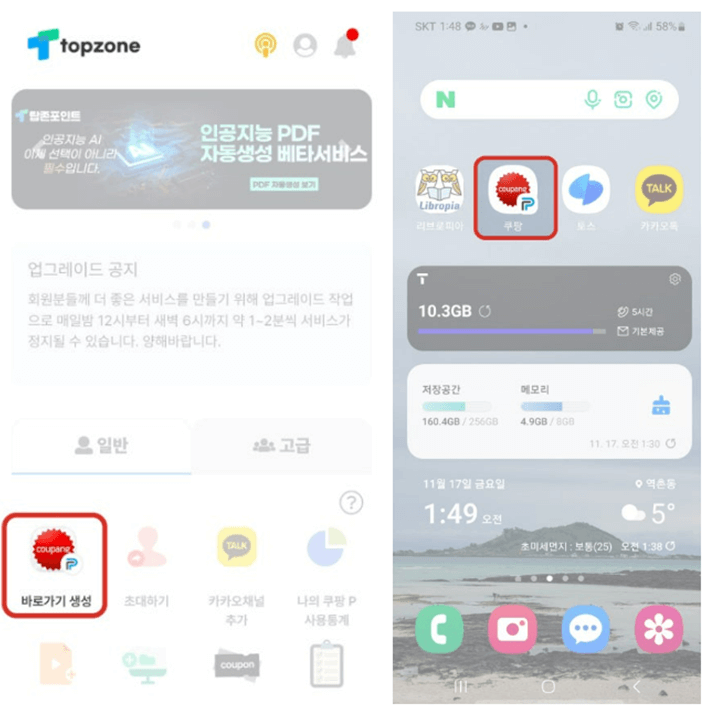 탑존포인트 일반탭 쿠팡P 바로가기 생성을 눌러서 바탕화면 홈화면에 설치해요.