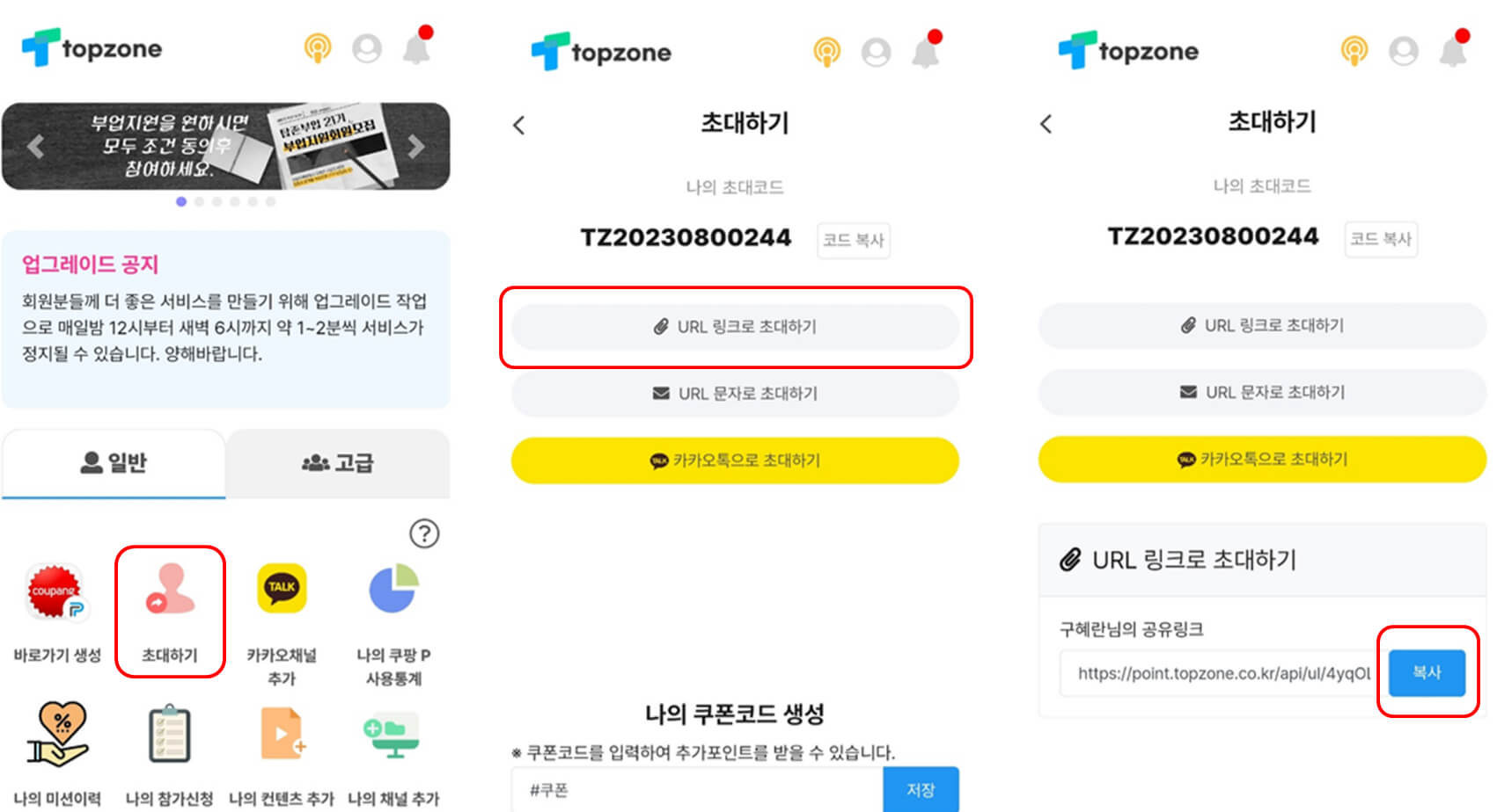 탑존포인트 일반탭 초대하기를 누르면 URL 링크로 초대하기를 통해 친구에게 회원가입을 추천하고