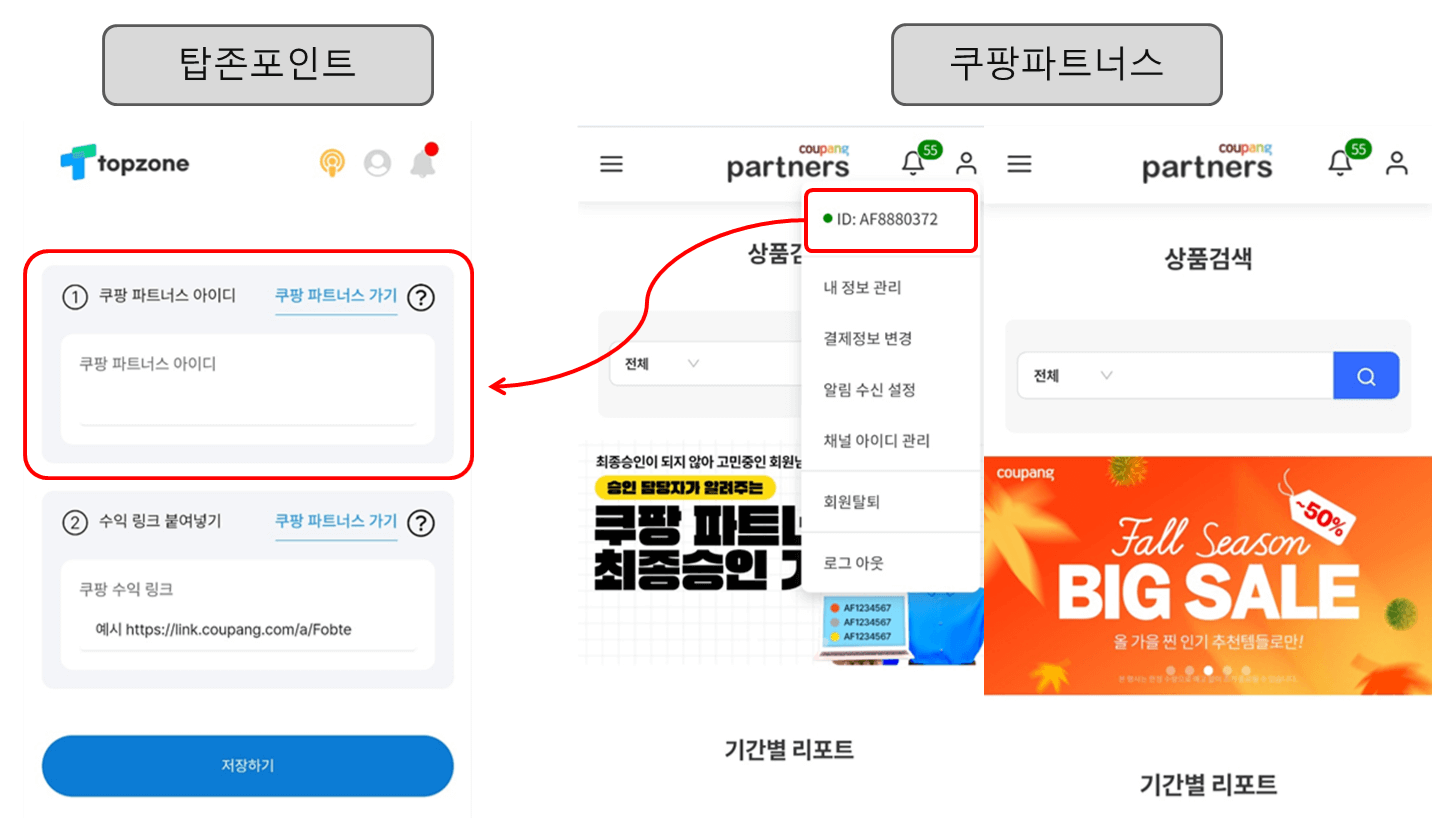 탑존포인트 고급탭 나의 부업설정에 나의 쿠팡파트너스 정보를 채웁니다.